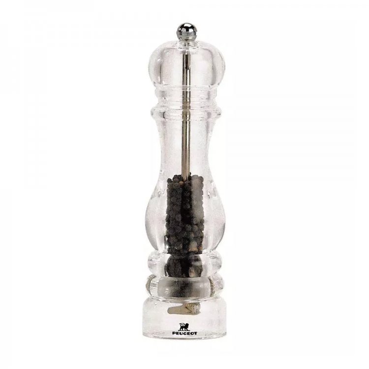 Macinapepe della linea Nancy di Peugeot, leader nel settore delle macine professionali per ristoranti ed hotel. Nancy è una linea dalla classica forma arrotondata in acrilico trasparente. La macina del pepe è in acciaio inox con meccanismo con doppia fila di denti elicoidali che catturano il grano, lo spingono verso il basso e lo bloccano per macinarlo perfettamente. Per un suo corretto utilizzo casa madre consiglia di utilizzare solo pepe in grani secchi da mm.5 o meno di diametro. Si può usare per macinare pepe verde, bianco o nero. Il pepe rosso invece può essere macinato solo se mescolato con altri grani di pepe (massimo 15% di miscela). Macina anche i semi di coriandolo purchè ben essiccati.