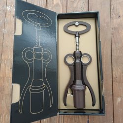 Levatappi manuale in acciaio verniciato nel colore testa di moro utilizzato per l'apertura delle bottiglie di vino con tappo in sughero o plastica. Essendo un modello a doppia leva, il funzionamento è semplice : si aprono le due ali laterali, si inserisce il verme in acciaio sul tappo e si ruota la testa del levatappi fino alla fine del tappo. Facendo una leggera pressione sui manici verso il basso, il tappo esce dalla bottiglia. E' un brevetto italiano di produzione artigianale. Ha una dimensione importante : alto cm.33 e largo cm.12 non è solo utile ma anche elemento di pregio che arreda la propria cucina. Venduto singolarmente nella sua confezione singola di ingombro cm.37,5x16,5 h.8. Peso kg.1. Consigliamo di pulirlo con un panno umido, non mettere in lavastoviglie.