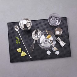 Bar Mat, tappetino antiscivolo in gomma, utilizzato da barman e baristi nei banconi di bar, locali serali, enoteche, discoteche, ristoranti, hotel ed anche nei chioschi presenti nelle sagre e feste all'aperto, per la preparazione di più spritz o cocktail o bevande di vario genere. Il tappetino permette al barista di mettere i bicchieri o i calici uno vicino all'altro e con destrezza versa rapidamente il contenuto dei vari cocktail sui diversi bicchieri. Nel caso in cui ci sia del prodotto che fuoriesce durante la frenesia della preparazione, questo viene raccolto la tappetino senza che si sporchi tutto il banco, gli utensili, i calici ed i bicchieri. E' un prodotto certificato, idoneo al contatto alimentare e lavabile in lavastoviglie. Disponibile in molteplici varianti dimensionali.