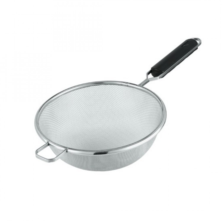 Colino in acciaio inox con rete a singola trama sempre in acciaio inox. Il manico è in abs anticalore. Sulla testa c'è un pratico gancio in acciaio perfetto per appendere lo strumento a fine lavoro. Il manico è lungo cm.27, il colino ha diametro cm.26, lunghezza gancio cm.5