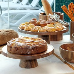 Elegante alzata in legno di acacia con finitura colore naturale con base e piatto rotondi e vassoio di diametro cm.29,5. La base ha altezza cm.10. Viene utilizzata dalle pasticcerie e dai ristoranti per esporre i dolci appena sfornati, dai B&B e dagli hotel e catering per proporre prodotti freschi di panificazione o salumi appena affettati. Essendo in legno consigliamo di pulirla con un panno umido e detergente neutro. E' un articolo di ottima finitura, che da un tocco country al buffet e che è ottimo anche per una cucina di casa.