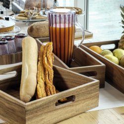 Cassettina in legno naturale di acacia di misura gastronorm 1/1 utilizzata nei buffet per l'esposizione del pane e dei prodotti di panificazione. Molto bella esteticamente e ben rifinita nei dettagli viene utilizzata anche come alzata per le cassettine di misure più piccole che sono componibili con la stessa. Ha due manici aperti arrotondati sul lato corto per spostarla agevolmente dal laboratorio all'esposizione. Perfetta assieme agli altri modelli della collezione legno di acacia per creare un'esposizione raffinata nei panifici e nelle pasticcerie. Ottimo articolo anche per B&B ed hotel. Venduta singolarmente è idonea al contatto alimentare.