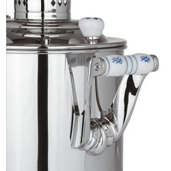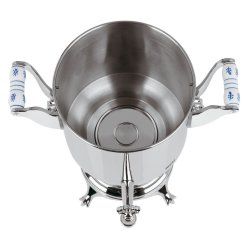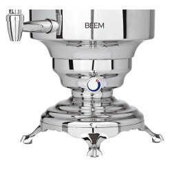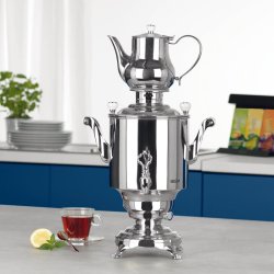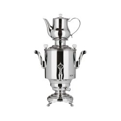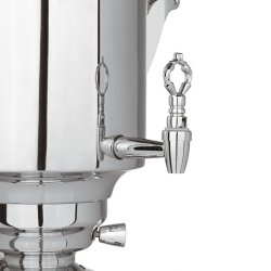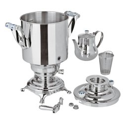 Distributore per tè e bevande calde modello Samovar Romanov. E' un prodotto professionale utilizzato nei buffet e nelle colazioni mattutine degli hotel, nelle case da tè e nei ristoranti raffinati. Completamente in acciaio inox 18/10, è formato da una pentola centrale con capacità lt.5 sopra la quale è inserita una teiera molto elegante sempre in acciaio inox con capacità lt.1,3. Il riscaldamento è elettrico, 230 V - 500/1800 Watt. Ai lati della pentola sono presenti due manici lavorati che servono per spostarla agevolmente senza scottarsi e la base è formata da un supporto circolare con piedini. Tutto in acciaio inox. Prodotto idoneo al contatto alimentare e certificato.