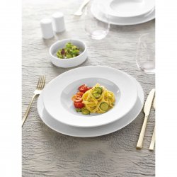 Piatto fondo pasta della collezione Omnia di Arthur Krupp. In fine porcellana alberghiera, è un prodotto semplice, dalla linea rotonda e falda ampia di cm.5,5. Il foro interno ha dimensione cm.19,3 e scende svasato. E' impilabile, aspetto molto importante nel momento dello stoccaggio a fine lavoro. E' lavabile in lavastoviglie e si può utilizzare in forno a microonde per riscaldare la pietanza. Utilizzato per servire tutti i primi di pasta, risotti, zuppe o brodi. A volte, qualche chef originale lo utilizza per servire insalate colorate e fresche.