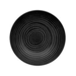 Insalatiera in robusto stoneware di colore nero metallico con spirale a rilievo in vernice reactive della collezione Orbit di Mesa Ceramics. E' una ciotola di diametro cm.17 ed altezza cm.4,8 monoporzione servito al cliente che richiede un contorno di verdura fresca. La forma è svasata. Complemento di una linea formata da piani di diversi diametri, piatto fondo e pasta nonchè ovale piano a bordo nordico, si abbina ad una tavola moderna e minimalista. Idonea al contatto alimentare è un prodotto dotato di certificazione moca. Venduta in imballi da 6 pezzi.