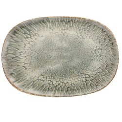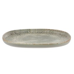 Piatto ovale della collezione Dust di Mesa ceramics. E' un piatto molto interessante perchè ha il bordo arrontondato ed alto 3 cm. Inoltre è ampio, di larghezza fa cm.23 e questo aspetto lo rende perfetto per ristoranti, agriturismi, birrerie e steack house per la presentazione dei secondi di carne o pesce con contorni. Il bordino non fa uscire le salse o i sughi di cottura. L'ovale è in stoneware, ceramica densa molto robusta, liscia e resistente ai lavaggi industriali. La colorazione è sottosmalto, quindi non decolora con il tempo, ed è reactive cioè unica. Ogni piatto è infatti diverso dagli altri grazie alla distribuzione casuale del colore in cottura che genera sfumature, rilievi e bruciature lungo il bordo. Dust ha un colorazione grigio/verde, che richiame le rocce, il granito e la terra. Ottimo anche per una tavola domestica. Si può lavare in lavastoviglie ed utilizzare in forno a microonde. Imballo da 4 pezzi venduto singolarmente. Ottima qualità made in Portogallo.