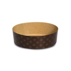Stampo rinforzato monouso per la cottura in forno del panettone, tipico dolce italiano dalla pasta soffice con canditi, uvetta e farciture alle creme in base alle numerosissime varianti presenti nelle diverse regioni d'Italia. E' un prodotto in carta di pura cellulosa super calandrata stampata nella parte esterna con bordo frastagliato. Dimensioni : diametro (alla base) di cm.18,5 ed altezza cm.6. Capacità : 750 gr. Venduto in confezioni da 60 pezzi. Idoneo al contatto alimentare è un prodotto certificato, utilizzato da pasticcerie, pastifici, panifici ed industria dolciaria.