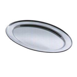 Vassoio in acciaio inox 18/10 di forma ovale con bordino arrotondato. E' un complemento alla tavola molto utilizzato per il servizio di secondi di carne o pesce e soprattutto i contorni. Leggero ed economico è idoneo al contatto alimentare e dotato di certificazione moca.